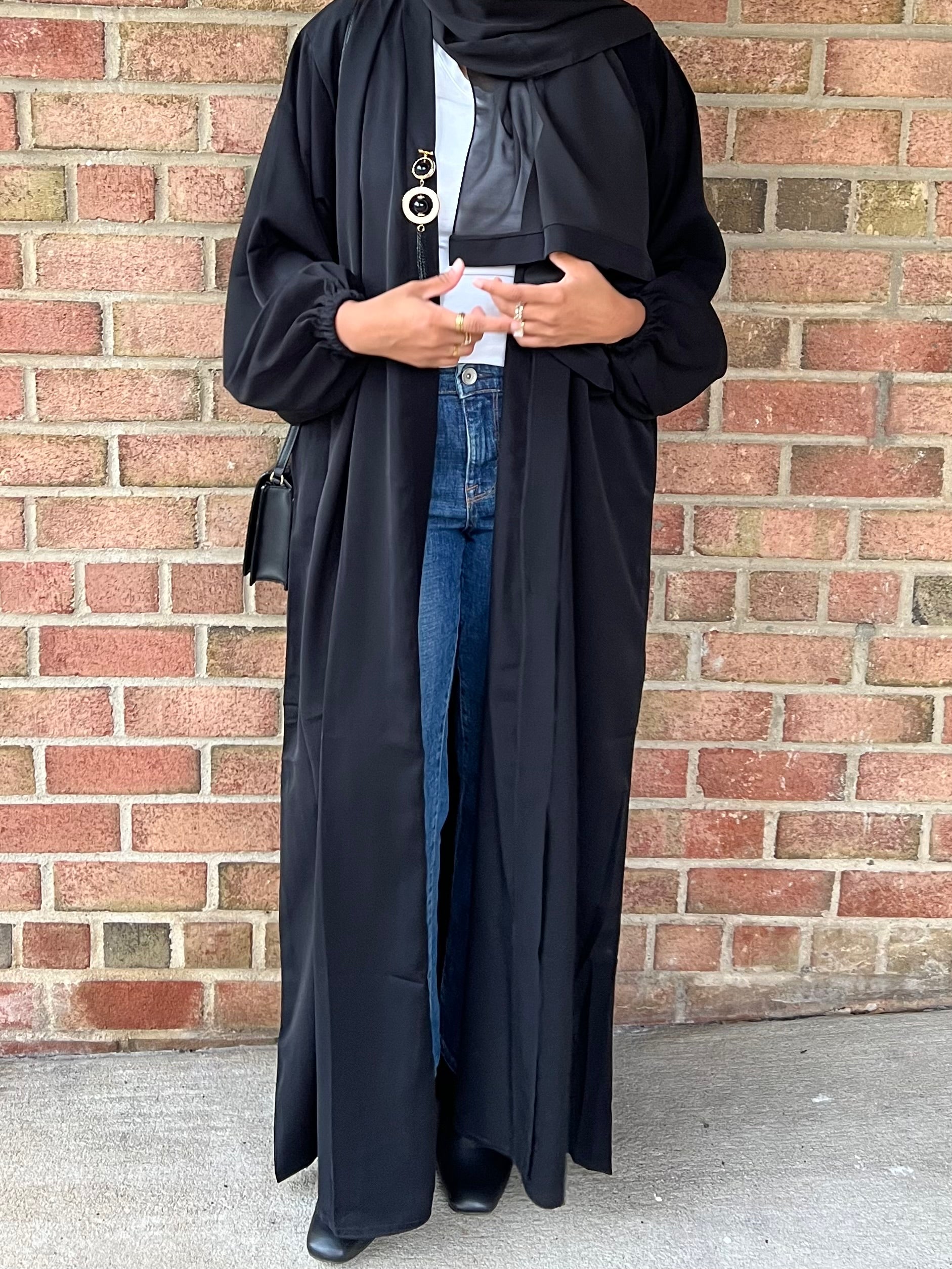 The Duwa Abaya is made from soft, breathable Nida fabric for all-day comfort. This three-piece set includes an open abaya, matching hijab, and belt. It’s perfect for everyday wear and still modest enough for Umrah or Hajj. Easy to style and pairs well with jeans for a simple, elegant look.