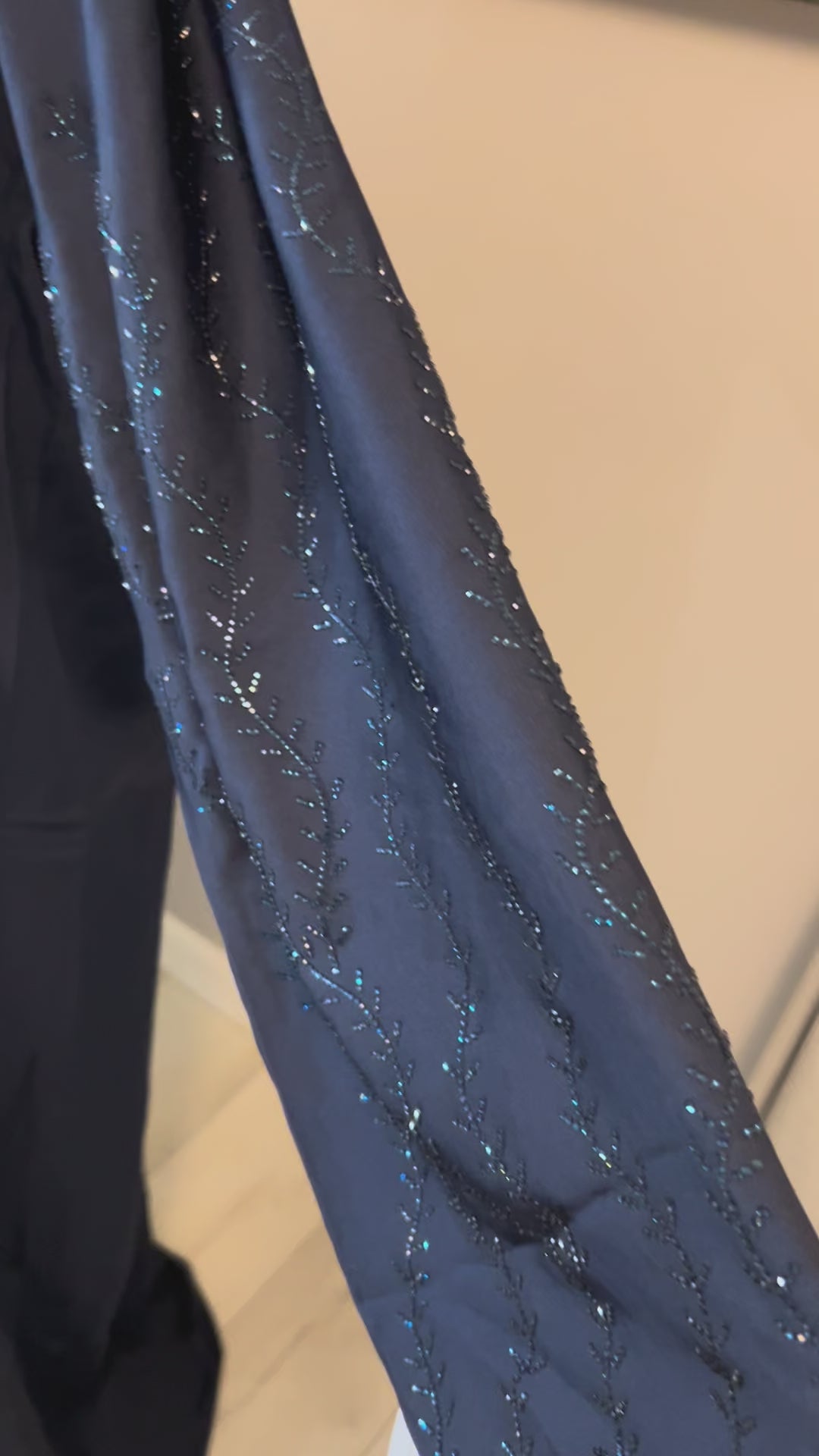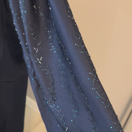 This elegant naby blue abaya is a timeless wardrobe essential. Made from soft, breathable fabric, it features subtle beadwork along the sleeves and hem for a touch of sparkle. The zip-up front adds convenience and a clean silhouette, making it ideal for both everyday wear and special occasions.